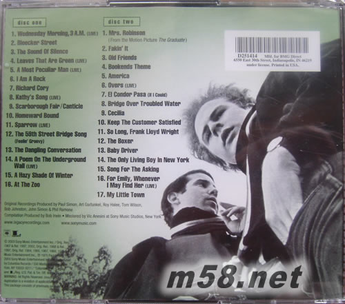 DISC ONE 1、THE SOUND OF SLLENCE 2、WEDNESTLAY MORNING 3 AM(LIVE) 3、BYE BYE LOVE 4、BLEECKER STREET 5、I AM A ROCK 6、A MOST PECULLAR MAN(LIVE) 7、RICHARD CORY 8、KATHY’S SONG(LIVE) 9、SCARBOROUGH FAIR/CANTICLE 10、HOMEWARD BOUND 11、SPARROW(LIVE) 12、LEAVES THAT ARE GREEN(LIVE) 13、HE WAS MY BROTHER 14、THE 59TH STREET BRIDGE SONG(FEELIN GROOVY) 15、THE DANGLING CONVERSATION 16、A POEM ON THE UNDERGROUND WALL(LIVE) 17、BLESSED(LIVE) 18、CLOUDY 19、BLUES RUN THE GAME 20、A HAZY SHADE OF WINTER DISC TWO 1、MRS。ROBINSON 2、BRIDGE OVER TROUBLED WATER 3、AT THE ZOO 4、FAKIN IT 5、OLD FRIENDS 6、BOOKENDS THEME 7、PUNKY‘S DILEMMA 8、OVERS(LIVE) 9、A CHURCH IS BURNING(LIVE) 10、AMERICA 11、EL CONDOR PASA 12、CECILIA 13、KEEP THE CUSTOMER SATISFIED 14、SO LONG,F(xiàn)RANK LIOYD WRIGHT 15、THE BOXER 16、BABY DRIVER 17、THE ONLY LIVING BOY IN NEW YORK 18、SONG FOR THE ASKING 19、FOR EMILY,WHENEVER I MAY FIND HER(LIVE) 20、MY LITTLE TOWN