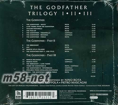 01. The Godfather: Waltz 02. The Godfather: Love Theme 03. The Godfather: Sicilian Pastorale 04. The Godfather: The Pick-up 05. The Godfather: Tarantella 06. The Godfather: Mazurka 07. The Godfather: Finale 08. The Godfather Part II: The Immigrant 09. The Godfather Part II: Kay 10. The Godfather Part II: Marcia Stilo Italiano 11. The Godfather Part II: End Title 12. The Godfather Part III: Marcia Religiosa 13. The Godfather Part III: Marcia Festa 14. The Godfather Part III: The Immigrant/Love Theme 15. The Godfather Part III: Intermezzo 16. The Godfather Part III: Preludio from Cavalleria Rusticana 17. The Godfather Part III: Coda (Finale)