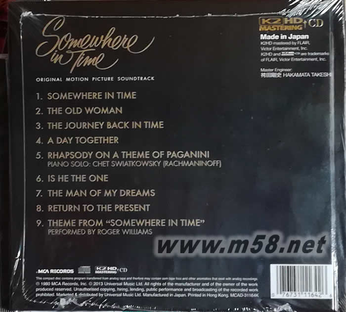 01. Somewhere In Time 02. The Old Woman 03. The Journey Back In Time 04. A Day Together 05. Rhapsody On A Theme Of Paganini 06. Is He The One 07. The Man Of My Dreams 08. Return To The Present 09. Theme From Somewhere In Time [preformed by Roger Williams]