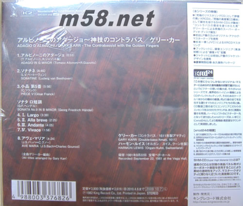 音響史上最著名的其中一張天碟,人稱 有金手指的低音大提琴 卡爾以史上最靚聲的AMATI四百年古琴拉奏。這張采用了XRCD24與SHMCD復合技術壓制的發燒經典版阿爾比諾尼柔板 ,是不可或缺的寶典