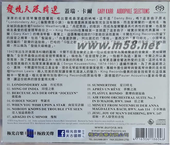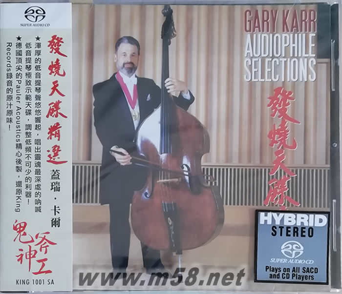 發(fā)燒天碟精選Audiophile Selections SACD(m58.net) 渾厚的低音提琴聲悠悠響起,唱出靈魂最深處的吶喊。低音提琴極致示范天碟,調(diào)整低頻不可少的利器! ★德國頂尖的Pauler Acoustics精心后製,還原King Records錄音的原汁原味! 渾厚的低音提琴聲悠悠響起,唱出靈魂最深處的吶喊。這不是「Danny Boy」嗎?這首曲子原名「Londonderry Air」(倫敦德里小調(diào)),倫敦德里與英國倫敦完全沒有關(guān)係,而是愛爾蘭的一處地名,后來被詞曲創(chuàng)作者Frederic Weatherly填上「丹尼男孩」的歌詞,而成為愛爾蘭最具代表性的音樂,也是發(fā)燒友最愛的低音提琴曲目之一。King Records在專輯第一首就選了這首曲子,確實非常能代表蓋瑞.卡爾(Gary Karr)的精湛琴藝。事實上,這張專輯收錄的13首曲目涵括蓋瑞.卡爾在King Records所留下的錄音之精華,包括「圣誕夜」、「向星星許愿」、阿比諾尼的「慢板」、蓋西文的「夏日時光」、小提琴名曲改編的「歡樂的迴旋曲」、巴哈的「G弦之歌」、「小步舞曲」,以及「耶穌,世人仰望的喜悅」等經(jīng)典詮釋,所以稱為「發(fā)燒天碟精選」。 1942年出生於美國洛杉磯的蓋瑞.卡爾不但是音樂史上第一位以低音提琴為獨奏樂器的音樂家,更被媒體譽為「全世界最杰出的低音提琴獨奏家」,稱他為「低音提琴之神」一點都不為過。蓋瑞.卡爾之所以廣受推崇,除了精湛的琴藝之外,他所演奏的阿瑪悌(Amati)名琴更是讓音響迷熱愛的主因。這把名琴是由俄裔美籍的大指揮家?guī)烊S斯基(Serge Koussevitzky, 1874-1951)遺孀所贈與,為了表達(dá)感恩之心,蓋瑞.卡爾還特別成立基金會,提供名琴給年輕音樂家使用。專輯中擔(dān)任鋼琴與管風(fēng)琴伴奏的是老搭檔Harmon Lewis,兩人完美的默契讓音樂充滿迷人的魅力,King Records優(yōu)異的錄音技術(shù)更在這張專輯中一覽無遺。極光音樂特別取得King Records的原始母帶,請德國的Pauler Acoustics重新母帶處理,讓這份經(jīng)典的錄音重現(xiàn)光輝。