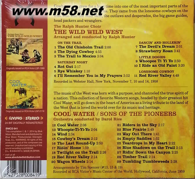 狂野西部 THE WILD WILD WEST 立體聲名盤(TAS專業(yè)推介發(fā)燒名盤)(m58.net) 發(fā)燒音響 (1/6/2014) Author: 亞厘士 全力推薦 赤裸裸,沒有修飾,全無隔閡的感情鋪陳,是聆聽這唱片的最大聽感。Living Stereo這CD收入了「The Wild Wild West」和「Cool Water」兩張黑膠唱片的曲目。錄音年份分別是1958和1959年,正值模擬錄音和真空管器材的黃金年代,也是立體聲錄音的啟蒙時(shí)期,膽咪、膽混音和開放式母帶的運(yùn)用,輕易捕捉了發(fā)燒樂迷最看重的堂音、殘響和空氣感。《The Trail To Mexico》引子的奔馬由右至左橫越音樂畫面,和弦節(jié)奏結(jié)他緩緩帶出瞭亮逼真的口哨聲,純樸的二部合唱歌聲融和悅耳,中后段的結(jié)他獨(dú)奏從音樂畫面突圍而出,音場(chǎng)的深度遠(yuǎn)超聆聽空間。簡(jiǎn)單的和弦結(jié)他勾指和口琴帶出了《Red River Valley》,較緩慢的音速益增離愁別緒,Ralph Hunter Choir的歌聲有催人落淚的感染力。作為「絕對(duì)音響」推薦名盤,這CD名實(shí)相符,筆者全力推薦!