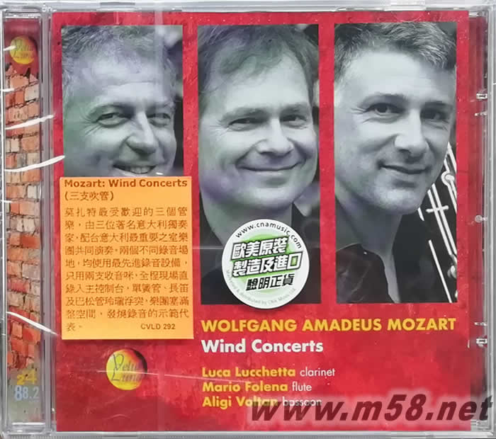 Mozart Wind Concerts 單簧管、長笛與巴松管(m58.net) 莫扎特最受歡迎的三個管樂,由三位著名意大利獨奏家,配合意大利最重要的之室內樂團共同演奏。兩個不同錄音場地,均使用最先進錄音設備,只用兩支收音咪,全程現場直錄入主控制臺,單簧管、長笛及巴松管玲瓏浮突,樂團塞滿整空間,發燒錄音的示範代表。