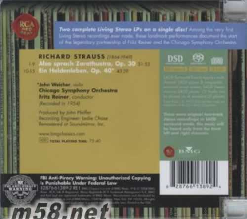 Strauss: Also Sprach Zarathustra Hybrid Stereo查.斯特勞斯:查拉圖斯特拉如是說(Living Stereo SACD)(m58.net) 指揮:FRITZ REINER 查拉圖斯特拉如是說”此曲是從德國文豪尼采同名的著作中,獲得靈感的,是一首哲學意味深濃的龐大交響詩,作品不僅有著作曲家對德國文化的深刻認識,同時也成功地在音樂中,傳譯出尼采的文學特質。 理查·斯特勞斯以強烈的企圖心,在“查拉圖斯特拉如是說”中實現了哲學音樂化的理想,曲中運用多調式的效果,將段落詩的韻味與情緒,描寫得相當傳神。而“莎樂美”的七紗舞,充滿東洋的神秘情調,是首深具管弦樂效果、變化無窮的作品。歌劇“玫瑰騎士”第二幕終場所奏的圓舞曲,經常單獨在音樂會中演奏,并被改編成各種樂器的獨奏曲。