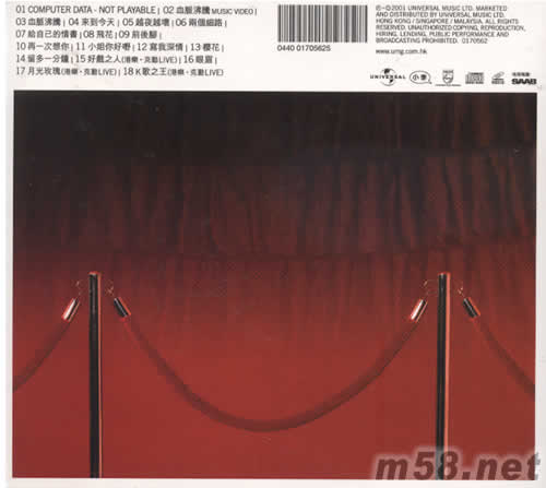 1、COMPUTER DATA-NOT PLAYABLE 2、.血脈沸騰MUSIC VIDEO 3血脈沸騰 4.來到今天 5.越夜越壞 6、.兩個細路 7.給自己的情書 8.飛花 9.前后腳 10.再一次想你 11.小姐你好0野 12.寫我深情 13.櫻花 14.留多一分鐘 15.好戲之人 (港樂·克勤Live) 16.眼眉 17.月光玫瑰 (港樂·克勤Live) 18.K歌之王 (港樂·克勤Live)
