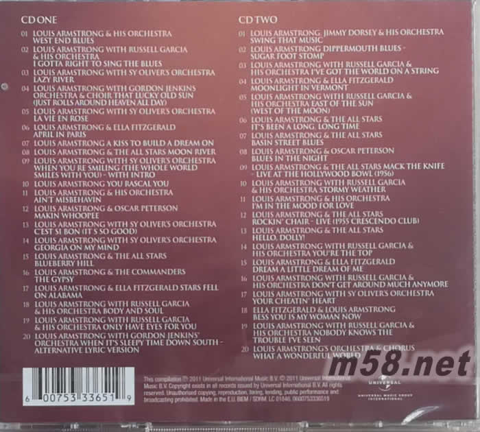DISK 1 CD 1. West End Blues / Louis Armstrong & His Orchestra 2. I Gotta Right To Sing The Blues / Louis Armstrong with Russell Garcia & His Orchestra 3. Lazy River / Louis Armstrong with Sy Oliver`s Orchestra 4. That Lucky Old Sun (Just Rolls Around Heaven All Day) / Louis Armstrong with Gordon Jenkins` Orchestra & Choir 5. La Vie En Rose / Louis Armstrong with Sy Oliver`s Orchestra 6. April In Paris / Louis Armstrong & Ella Fitzgerald 7. A Kiss To Build A Dream On / Louis Armstrong 8. Moon River / Louis Armstrong & The Allstars 9. When You`re Smiling (The Whole World Smiles With You) - With Intro / Louis Armstrong with Sy Oliver`s Orchestra 10. You Rascal You / Louis Armstrong 11. Ain`t Misbehavin / Louis Armstrong & His Orchestra 12. Makin Whoopee / Louis Armstrong & Oscar Peterson 13. C`est Si Bon (It`s So Good) / Louis Armstrong with Sy Oliver’s Orchestra 14. Georgia On My Mind / Louis Armstrong with Sy Oliver`s Orchestra 15. Blueberry Hill / Louis Armstrong & The All Stars 16. The Gypsy / Louis Armstrong & The Commanders 17. Stars Fell On Alabama / Louis Armstrong & Ella Fitzgerald 18. Body And Soul / Louis Armstrong with Russell Garcia & His Orchestra 19. Only Have Eyes For You / Louis Armstrong with Russell Garcia & His Orchestra 20. hen It`s Sleepy Time Down South - Alternative Lyric Version / Louis Armstrong with Gordon Jenkins` Orchestra DISK 2 CD 1. Swing That Music / Louis Armstrong, Jimmy Dorsey & His Orchestra 2. Dippermouth Blues - Sugar Foot Stomp / Louis Armstrong 3. I`ve Got The World On A String / Louis Armstrong with Russell Garcia & His Orchestra 4. Moonlight In Vermont / Louis Armstrong & Ella Fitzgerald 5. East Of The Sun (West Of The Moon) / Louis Armstrong with Russell Garcia & His Orchestra 6. It`s Been A Long, Long Time / Louis Armstrong & The All Stars 7. Basin Street Blues / Louis Armstrong & The All Stars 8. Blues In The Night / Louis Armstrong & Oscar Peterson 9. Mack The Knife - Live At The Hollywood Bowl (1956) / Louis Armstrong & The All Stars Mack The Knife 10. Stormy Weather / Louis Armstrong with Russell Garcia & His Orchestra 11. I`m In The Mood For Love / Louis Armstrong & His Orchestra 12. Rockin` Chair - Live (1955 Crescendo Club) / Louis Armstrong & The All Stars 13. Hello, Dolly! / Louis Armstrong & The All Stars 14. You`re The Top / Louis Armstrong with Russell Garcia & His Orchestra 15. Dream A Little Dream Of Me / Louis Armstrong & Ella Fitzgerald 16. Don`t Get Around Much Anymore / Louis Armstrong with Russell Garcia & His Orchestra 17. Your Cheatin` Heart / Louis Armstrong with Sy Oliver`s Orchestra 18. Bess You Is My Woman Now / Ella Fitzgerald & Louis Armstrong 19. Nobody Knows The Trouble I`ve Seen / Louis Armstrong with Russell Garcia & His Orchestra 20. What A Wonderful World / Louis Armstrong`s Orchestra & Chorus