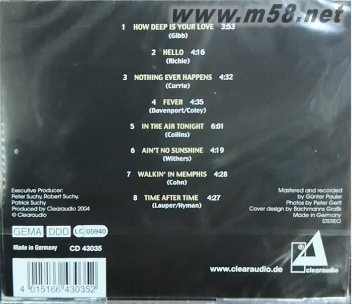 FRIENDS OF CARLOTTA絕世歌聲(m58.net) Live in Studio是一張非常與眾不同的人聲多重唱珍藏作品。1999年原版推出時(shí),全球只發(fā)行2000張,而當(dāng)時(shí)有幸可擁有及欣賞到這張發(fā)燒專(zhuān)輯的人屈指可數(shù),導(dǎo)致很多向往此張專(zhuān)輯的愛(ài)樂(lè)者不斷四出搜尋這張珍貴專(zhuān)輯。今年德國(guó)著名發(fā)燒音響品牌Clearaudio特別為這對(duì)Friends of Carlotta組合簽訂了全球性合約為他們發(fā)表這張令發(fā)燒樂(lè)迷引頸期待之完美作品。Clearaudio更引用了全新制碟模式原版直刻技術(shù)(DIRECT-TO-DISC From Master Tape)直接把原始母帶的音源直接印錄在CD當(dāng)中,將原有的音色訊號(hào)一點(diǎn)一滴完全穩(wěn)定鎖進(jìn)CD里。此專(zhuān)輯過(guò)去數(shù)年間在世界各地不同的高科技音響展覽會(huì)上均被用作各種器材的示范軟件,此碟不但錄音出眾,加上眾演唱或演奏家的超凡演繹,再一次確定了一張真正成功的發(fā)燒錄音軟件,必須具備高科技及高水準(zhǔn)演繹下不可劃缺的元素。然而今天在少數(shù)杰出的制作人當(dāng)中,有能力可以平衡高科技與完美藝術(shù)之間可共存之處,而今天電腦輔助音樂(lè)制成品之最終問(wèn)題是歌曲與歌曲之間前半拍的斷層現(xiàn)像,而原版直刻技術(shù)DIRECT-TO-DISC使訊號(hào)遺失的問(wèn)題亦可迎刃而解。 Friends of Carlotta是六人為一體靚聲組合,他們不單是合作無(wú)間的絕佳配搭,也是各自擁有個(gè)人風(fēng)格之老拍檔;雖然爵士(Jazz)和藍(lán)調(diào)(Blues)是他們演繹最多和閱歷至深之音樂(lè)種類(lèi),但當(dāng)他們遇到他們喜愛(ài)的作品時(shí),他們亦會(huì)盡情一試,因此這張集合八首非常流行歌曲的小品專(zhuān)輯《Live in Studio》亦隨之應(yīng)運(yùn)而生。因?yàn)檫@六位老拍檔合作已久的關(guān)系,直覺(jué)的大家亦明白瞭解到各自有自我的長(zhǎng)處,但更清楚到亦需要互相彌補(bǔ)彼此不足之處,包括聲調(diào)與樂(lè)器之間的互相運(yùn)用,令彼此配合無(wú)間,所以他們?cè)诒緦?zhuān)輯中表現(xiàn)得很和諧及協(xié)調(diào),不同的人聲與樂(lè)器之間的層次空間感,錄音寬闊、人聲質(zhì)感濃烈;這種曲風(fēng)與一些老牌歌手重唱經(jīng)典作品又是另一回事,無(wú)論是腔調(diào)、情感、語(yǔ)音和各音節(jié)之間的表現(xiàn)均被他人翻唱來(lái)得更加有張力和更具感染力。