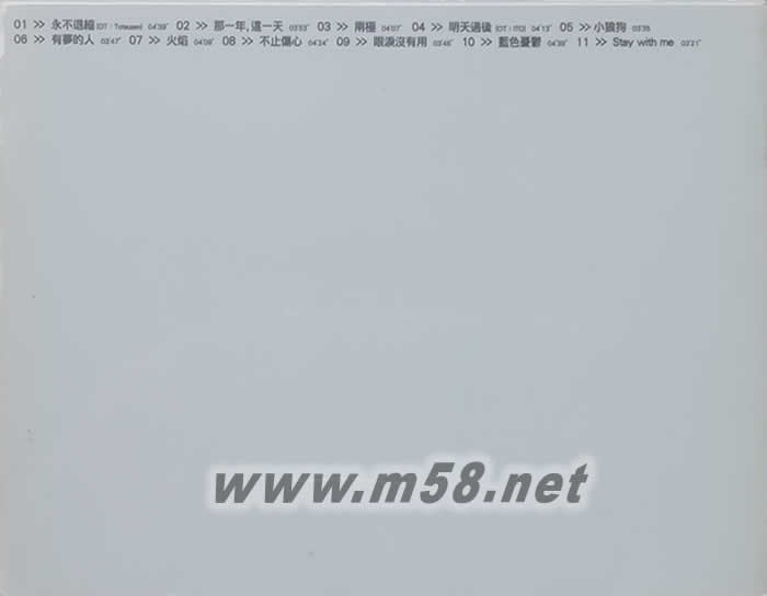 01. 永不退縮 02. 那一年, 這一天 03. 兩極 04. 明天過后 05. 小狼狗 06. 有夢的人 07. 火焰 08. 不止傷心 09. 眼淚沒有用 10. 籃色憂郁 11. Stay With Me