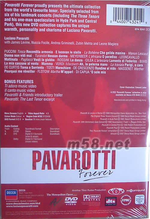 01 Puccini: Recondita armonia 普契尼:托斯卡 – 微妙的和諧 02 Meyerbeer: O paradiso 麥亞貝爾:非洲少女 - 噢!天堂 03 Leoncavallo: Mattinata 雷翁卡瓦洛:晨歌 04 Rossini: La danza 羅西尼:音樂晚會 - 舞蹈 05 Cilea: Lamento di Federico 西利亞:費德利可的悲歌 06 Bixio: La mia canzone al vento比奇歐:風(fēng)中的歌 07 Verdi: Ah la paterna mano 威爾第:馬克白斯 - 你們父親的手不能保護你們 08 De Curtis: Torna a Surriento 克提斯:歸來吧!蘇蘭多 09 Puccini: E lucevan le stelle 普契尼:托斯卡 – 星光閃耀 10 Tosti: Marechiare 陶斯第:馬雷恰雷海 11 Leoncavallo: Vesti la giubba 雷翁卡瓦洛:丑角 - 穿上彩衣 12 Verdi: Parigi, o cara (with Nuccia Focile) 威爾第:茶花女 - 愛人,讓我們遠(yuǎn)離巴黎 13 De Crescenzo: Rondine al nido 奎山諾:燕歸來 14 Puccini: Che gelida manina 普契尼:波西米亞人 - 你那好冷的小手 15 Massenet: Pourquoi me réveiller 馬斯奈:維特 - 為何喚醒我 16 Bixio: Mamma比奇歐:媽媽 17 Flotow: M'apparì tutt'amor 弗洛托:瑪塔 - 彷如一夢 18 Puccini: Donna non vidi mai 普契尼:馬儂.雷斯考 – 小姐我從未見過妳(不曾見過這樣的美人) 19 Di Capua: 'O sole mio 狄.卡普瓦:我的太陽 20 Puccini: Nessun dorma普契尼:杜蘭朵公主 – 無人能睡