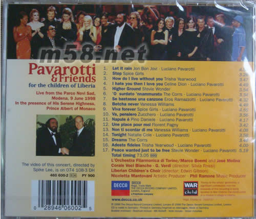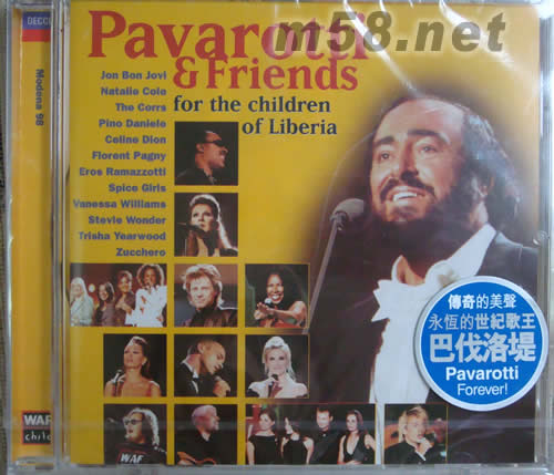 FOR THE CHILDREN OF LIBERIA(m58.net) 帕瓦羅蒂與朋友們為利比亞的兒童而唱 自1996年始,PAVAROTTI每年都要在意大利的家鄉MODENA舉辦PAVAROTTI&FRIENDS慈善音樂會,因此PAVAROTTI&FRIENDS也早已成為演藝界的大事,巨星云集。此舉真可謂一舉數得,那些戰爭中的兒童、需要幫助的孩子首先得益;PAVAROTTI本身和他的家鄉、祖國當然面上有光;演唱界巨星們也有了一展歌喉的舞臺。做善事誰不樂意? 至于哪些巨星參加了這些演唱會,看背面的照片就知道了。