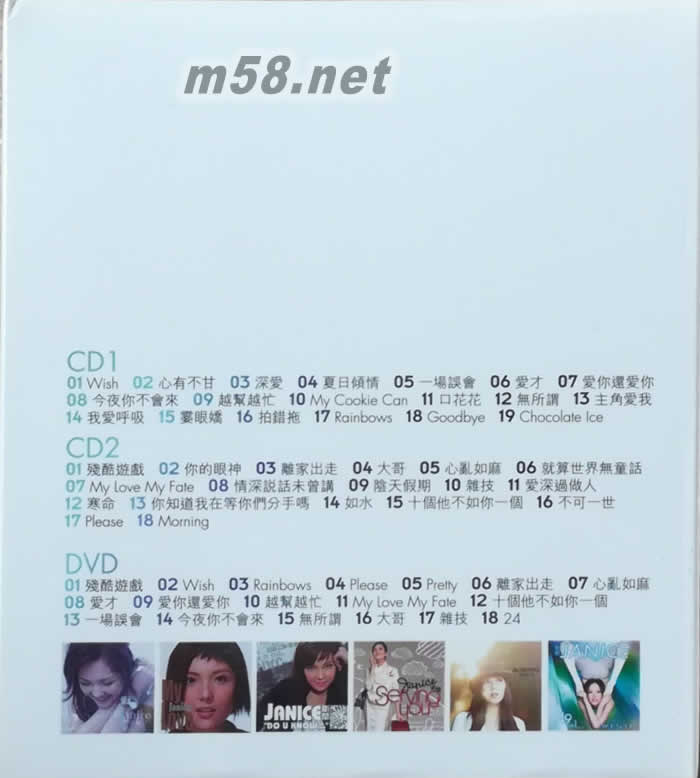 Wish (新曲+精選) 2CD+DVD(m58.net) 衛蘭 2009 新歌+精選大碟 Wish (2 CD+DVD) 大碟收錄4首全新歌曲: Wish 心有不甘 你的眼神 及主力推介歌曲 殘酷游戲 衛蘭首張精選碟 收錄入樂壇以來最Hit 28首精選歌曲 包括: 大哥, 心亂如麻, My Love My Fate, 如水, 愛才, 就算世畀無童話... 等大熱歌曲 全碟新曲+精選歌曲合共32首 首批特別版 加送DVD 包括3首全新MV及14首精選MV 共17首MV 衛蘭 (Janice) 2009年繼英文碟《Morning》后,再推出首張精選碟《Wish》 ,唱片封套以大膽創新的瑜伽造型示人,令人眼前一亮。Janice 這張2CD+DVD中收錄了四首新歌,另加上「大哥」、「心亂如麻」、「My Love My Fate」、「如水」、「愛才」和「就算世畀無童話」等28首出道以來代表作 ,在佳節之前向樂迷送上一份大禮。 《Wish》由雷頌德監制,Janice 演繹了三首舊曲新詞的經典作品,由林夕再譜粵語版歌詞,其中「心有不甘」改編自陳淑樺主唱的「夢醒時分」,至于「殘酷游戲」則源自李圣杰的「癡心絕對」,點題曲「Wish」是一首宣揚和平主打作品。 首批特別版加送包括三首全新MV及14首重點精選MV DVD。