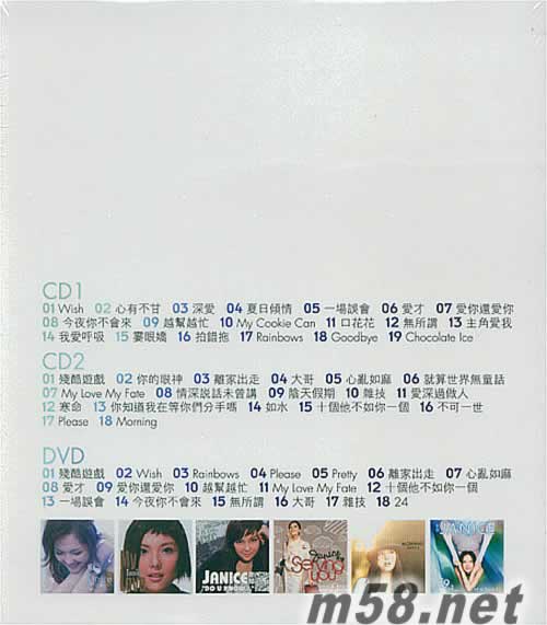 Wish JANICE 2010新曲+精選 2CD+DVD(m58.net) 衛蘭 新歌+精選大碟 “ Wish ” (2 CD+DVD) 現推出 2nd ver.-完美版 全新封面 CD加送5首精選歌曲 DVD加送 “殘酷游戲” MV 衛蘭首張精選碟 CD收錄4首全新歌曲:- “Wish”“心有不甘”“你的眼神 及 主力推介歌曲 “殘酷游戲” CD另收錄入樂壇以來最Hit 33首精選歌曲 包括:- “大哥”“心亂如麻” “My Love My Fate” “如水” “愛才” “就算世畀無童話”..等大熱歌曲 2nd ver.-完美版 CD 新曲+精選歌曲合共37首歌曲 DVD 全新MV及精選MV 共18首MV