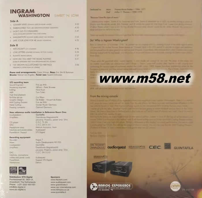 Sweet n Low (180g LP) STS DMM黑膠(m58.net) 這張專輯是發(fā)燒男聲英格倫.華盛頓獻給已去世父母的心聲,在選曲上是充滿父子、母子親情的寫照,他略帶沙啞的聲線性感而充滿超乎尋常的磁力。專輯在STS Digital自設專用錄音室收錄,全碟使用近咪收錄法,沒添加Reverb效果和其他輔助器材,這是華盛頓最愛的10首作品,也是STS Digital老板最凸顯其金耳朵功駕之專輯。