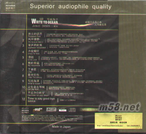 寫給海洋 XRCD(m58.net) Write to ocean(寫給海洋)JIANG ZHIMIN (江智民)國際著名發燒品牌靚聲唱片 05年度首張頂級人聲天碟率先被[國際音響工作師協會],選定為研討會主題[新真理],也被360位來自世界各地之音響專業人士,認為是(前無古人)的最發燒人聲錄音制作!這張專集錄音時麥克風的成功擺位占了非常重要的部分,定位一流,精準無誤,結像力,空氣感和層次感顯著,傳神到不得了![寫給海洋]在瑞典、荷蘭、新加坡、臺灣等地的[音響論壇]、[音響技術]、[HI-FI音響]、[唱片圣經]、[發燒友唱片指南]等權威雜志對此碟好評如潮,并給予肯定:[寫給海洋]為中國人揚眉吐氣。很多國際音響品牌竟相爭取讓[寫給海洋]為自己的產品做獨家試音碟。 不管你已有了幾張所謂的"人聲天碟" 這張一上架其余可能都將退位 --[發燒友唱片指南] 主編:小梁