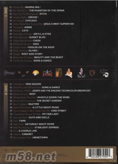 DISC 1 01. Mamma Mia -MAMMA MIA! 02. All I Ask Of You -THE PHANTOM OF THE OPERA 03. Don't Cry For Me Argentina -EVITA 04. Summer Nights -GREASE! 05. All That Jazz -CHICAGO 06. I Don't Know How To Love Him -JESUS CHRIST SUPERSTAR 07. Tomorrow -ANNIE 08. Memory -CATS 09. Once Upon A Dream -JEKYLL&HYDE 10. With One Look -SUNSET BLVD. 11. I Know Him So Well -CHESS 12. Written In The Stars -AIDA 13. Sunrise,Sunset -FIDDLER ON THE ROOF 14. I'd Do Anything -OLIVER! 15. Tonight -WEST SIDE STORY 16. Beauty And The Beast -BEAUTY AND THE BEAST 17. Tell Me On A Sunday -SONG&DANCE DISC 2 01. I Still Believe -MISS SAIGON 02. Take That Look Off Your Face -SONG&DANCE 03. Any Dream Will Do -JOSEPH AND THE AMAZING TECHNICOLOR DREAMCOAT 04. Seasons Of Love -RENT 05. Whistle Down The Wind -WHISTLE DOWN THE WIND 06. How Could I Ever Know -THE SECRET GARDEN 07. Back To Before -RAGTIME 08. Send In The Clowns -A LITTLE NIGHT MUSIC 09. You're Getting To Be A Habbit With Me -42ND STREET 10. I Could Have Danced All Night -MY FAIR LADY 11. Guys And Dolls -GUYS AND DOLLS 12. Fame -FAME 13. Night Fever -SATURDAY NIGHT FEVER 14. Belle The Sleeping Car -STARLIGHT EXPRESS 15. One -A CHORUS LINE 16. Cabaret -CABARET 17. Run,Freedom,Run! -URINETOWN