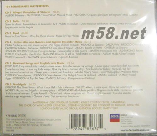101 Renaissance Masterpieces 文藝復興名曲101(m58.net) 「文藝復興」指的是十四世紀末到十七世紀歐洲「復興古希臘、羅馬文明」的文化運動。「文藝復興」的涵意是「重生」,但是這個變革沒有把歐洲帶回古社會,而是開啟了近代文明。 文藝復興的音樂中心約在法國南方、荷蘭、比利時附近,音樂家們致力於把未系統化的音樂加以整理,建立規則理論,為西方近代音樂建立基礎;音樂創作則以宗教彌撒曲和世俗的「牧歌」為兩大代表音樂,而這兩種音樂又彼此微妙的互相影響。 以宗教音樂來說,羅馬樂派的帕勒斯提那引進世俗牧歌的抒情優美,再加上精巧的聲部處理與裝飾音,使其作品成為聲音的圣像,脫離葛麗果圣歌的肅穆。帕勒斯提那的作品多達六、七百首,影響深遠。另一方面,眾商云集的威尼斯發展出有別於羅馬,更華麗多彩且龐大的「威尼斯樂派」,代表作家是加布里耶利。由於在表演形式上的冒險企圖心,器樂發達自不在話下,威尼斯也在日后成為器樂重鎮。 「牧歌」是一種世俗情歌,內容包羅萬象,體裁不若宗教音樂精致,但是就精神來說,「牧歌」才是文藝復興精神之最,以歌詞把情感交織到音樂里,其中最有名的是文藝復興晚期的蒙臺威爾第。牧歌的唱片相當多,今人多用美化的歌聲和器樂來演出,別有一番脫俗風味。 「文藝復興」發現了藝術上的新大陸,讓西方現代音樂尋得柳暗花明之路。而這套專輯所選出來的,即為文藝復興時期各個地區代表性作曲家的宗教音樂或牧歌,包括義大利阿雷格里、帕勒斯提那、蒙臺威爾第;西班牙維多利亞;英國泰利斯、威廉‧伯德、道藍、紀本斯、莫雷;法比作曲家若斯坎……等人的作品。其中特別值得一提的,即是收錄了兩位中世紀作曲家Francis Cutting與John Johnson編曲的兩個《綠袖子》版本。