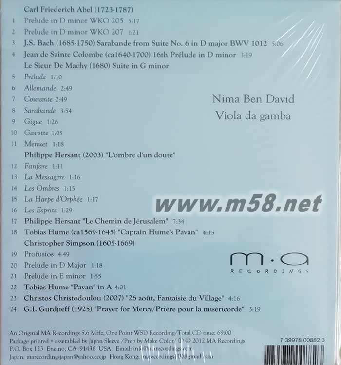Karl Friederich Abel (1723-1787) 1) Prélude in D minor WKO 205 5:17 2) Arpeggio in D minor WKO 207 2:21 3) J.S. Bach (1685-1750): Sarabande from suite No. 6 in D major 5:06 4) Mr. de Sainte Colombe (ca: 1640-1690): Prélude in D minor 3:19 Le Sieur De Machy (1680) Suite 5) Prelude 1:10 6) Allemande 2:49 7) Courante 2:49 8) Sarabande 3:54 9) Gigue 1:26 10) Gavotte 1:05 11) Menuet 1:18 Philippe Hersant (2003) ?L'Ombre d'un Doute? 12) Fanfare 1:11 13) La Messagere 1:16 14) Les Ombres 1:17 15) La Harpe d?Orphee 1:15 16) Les Espirits 1:29 17) Le Chemin de Jerusalem 7:34 18) Tobias Hume (ca: 1569-1645) Captain Hume's Pavan (No 46 from Musical Humors) 4:15 CH.Simpson (1605-1669) 19) Profusios 4:49 20) Prélude in D Major 1:18 21) Prélude in E minor 1:55 22) Tobias Hume: Pavan in A 4:01 23) Ch.Christodoulou (2007): Fantaisie du Village 4:16 24) G.I. Gurdjieff: (1925) Prière pour la miséricorde 3:19