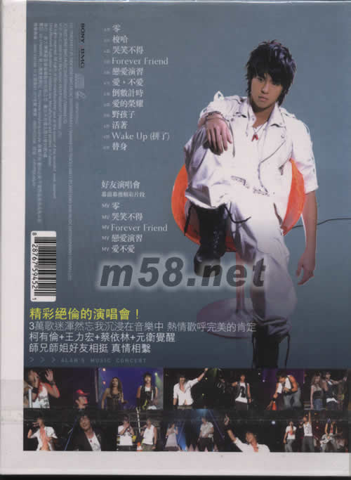 價格為估,以實到貨為準(zhǔn)! 柯有倫首張創(chuàng)作專輯 慶功收藏版(m58.net) 柯有倫 2005首張同名專輯給你好音樂慶功收藏版, 絕贊擁有CD+VCD+2006演唱會寫真年歷! · CD好音樂12首精彩音樂創(chuàng)作; · 近60分鐘VCD絕贊加值收錄: -柯有倫精彩絕倫的「臺南好友演唱會」精彩片段:三萬歌迷渾然忘我沉浸在音樂中,熱情歡呼完美肯定王力宏+蔡依林+元衛(wèi)覺醒「臺南 好友演唱會」精彩片段+楊丞琳等師兄師姐好友相挺 真情相系! -五首超強主打MV:五首MV音樂人的極致表現(xiàn),佳評如潮,口碑推薦! 生代創(chuàng)作新勢力 SONYBMG年度新人柯有倫(Alan),等待六年從「零」出發(fā),夢想燃燒,推出同名大碟《柯有倫》! 從幫師姐莫文蔚「愛死你」唱RAP嶄露頭角,到連續(xù)為兩部知名偶像劇《求婚事務(wù)所》及F4 仔仔所主演的《戰(zhàn)神》分別創(chuàng)作并演唱主題曲「拼了」及「零」,讓大家第一次認(rèn)識到柯有倫的唱功︰ · 「零」︰第一主打是一首充滿勁道的抒情搖滾歌曲,柯有倫除了渾厚嗓音之外,副歌的真假音轉(zhuǎn)換也令人印象深刻; · 「拼了」︰單從詞曲表面上看來,這是一首搖滾情歌。而Alan 表示這首歌是寫給他驟逝的父親—柯受良的。 在這張專輯中可以看出柯有倫多元化的創(chuàng)作能力,帶有Hip-Hop與搖滾曲風(fēng)的「梭哈」、「野孩子」、「活著」由柯有倫包辦詞曲,「倒數(shù)計時」則是方文山的詞,柯有倫譜曲。其中︰ · 「梭哈」︰是和金曲獎最佳制作人阿弟仔一起激蕩創(chuàng)意火花寫出的作品,以撲克牌賭桌上的「梭哈」來比喻把馬子追女仔不知成功機會多大,但是仍想孤注一擲梭哈贏回芳心。 · 「野孩子」︰是AlanN自述式的歌曲,表達出野孩子雖然看起來反叛,但是對于自己的愛情、夢想與喜歡的音樂卻有自己的堅持。 · 「Forever Friend」︰是柯有倫生平第一首創(chuàng)作曲,代表了他對友情的重視。 · 隨碟特別為香港樂迷收錄廣東作品「替代」。 2005最受肯定的音樂制作 今年最具爆發(fā)力的樂壇新聲 好友演唱會 幕前幕后精采片段獨家直擊+5首超強主打MTV CD+VCD+2006演唱會寫真年歷 絕贊收錄