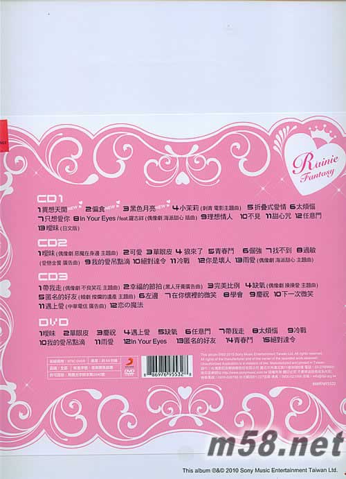 異想天開-新歌+精選~限量超大盒裝旗艦版3CD+DVD+相框+寫真卡(m58.net) 在Rainie的音樂里 所有的奇幻異想 浪漫夢境都能成真... 3首新歌+35首冠軍主打精選+15首冠軍主打MV 限量超大盒裝旗艦版 3CD+DVD+立體相框+12張超大精美寫真卡 旗艦版以超大盒包裝,內附立體相框和12張超大精美寫真卡,限量發售。