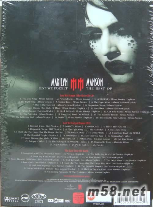 LEST WE FORGET(THE BEST OF) CD 1.: The Love Song 2.: Personal Jesus 3.: Mobscene 4.: The Fight Song 5.: Tainted Love 6.: The Dope Show 7.: This is the New Hit 8.: Disposable Teens 9.: Sweet Dreams (Are Made of This) 10.: Lunchbox 11.: Tourniquet 12.: Rock is Dead 13.: Get Your Gunn 14.: The Nobodies 15.: Long Hard Road out of Hell 16.: The Beautiful People 17.: The Reflecting God 18.: (S) Aint 19.: Irresponsible Hate Anthem LEST WE FORGET BONUS DVD 1.: Personal Jesus 2.: (S) Aint 3.: Mobscene 4.: This is the New Shit 5.: Disposable Teens 6.: The Fight Song 7.: The Nobodies 8.: The Dope Show 9.: I Don't Like the Drugs (but the Drugs Like Me) 10.: Rock is Dead 11.: Coma White 12.: Long Hard Road out of Hell 13.: The Beautiful People 14.: Tourniquet 15.: Man That You Fear 16.: Cryptorchid 17.: Sweet Dreams (Are Made of This) 18.: Dope hat 19.: Lunchbox 20.: Get Your Gunn 21.: Autopsy 22.: The Making of Mobscene 23.: Disposable Teens 24.: Major Releases 25.: Photo Gallery 26.: Credits THE LAST TOUR ON EARCH 1.: Inauguration of the Mechanical Christ 2.: The Reflecting God 3.: Great Big White World 4.: Get Your Gunn 5.: Sweet Dreams / Hell Outro 6.: Rock is Dead 7.: The Dope Show 8.: Lunchbox 9.: I Don't Like the Drugs (but the Drugs Like Me) 10.: Antichrist Superstar 11.: The Beautiful People 12.: Irresponsible Hate Anthem 13.: The Last Day on Earth 14.: Astonishing Panorama of the Endtimes