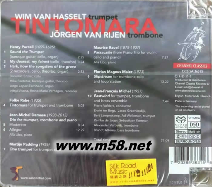 蒂托瑪拉 Tintomara 小號與長號 SACD(m58.net) Wim van Hasselt (小號) Jörgen van Rijen (長號) 史托蒂恩低音大提琴/邁雅豎琴/布羅曼小提琴,演奏皮亞佐拉、電影配樂大師羅塔、西班牙作曲家法雅作品,低音提琴、豎琴及小提琴的配合默契,動態十足、琴音繽紛。
