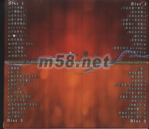 DISC 1 1、不可推搪 2、不羈舞臺 3、我來自北京 4、夏日燒著了 5、夜變得精彩 6、YA YA YA 7、赤色黎明 8、I LOVE U OK? 9、我的親愛 10、我愛ICHI BAN 11、人在邊緣 12、人在黎明 13、相逢在雨中 DISC 2 1、今夜你會不會來 2、我的感覺 3、如果這是情 4、但愿不只是朋友 5、我會像你一樣傻 6、無名份的浪漫 7、情是我所有 8、親近你 9、是愛是緣 10、永相依 11、真愛在明天-黎明、周慧敏 12、夜夜夢中見 13、因你在此 DISC 3 1、傻癡癡 2、兩心知 3、真的愛情定可到未來 4、愿你今夜別離去 5、我的另一半 6、OH!夜 7、一夜傾情 8、對不起、我愛你 9、你是否天使 10、為什么我們只是朋友 11、傷心的背后 12、情歸落泊 13、不戀你 DISC 4 1、心愛 2、愛情影書戲 3、夏日傾情 4、堆積情感 5、今生相愛,來生再相聚 6、深秋的黎明 7、今夜你會不會來 8、孤單的人孤單的我 9、戀愛日記 10、情難自控 11、情像雨漂泊 12、愛還是不要說的好 13、誰領我的心靠岸