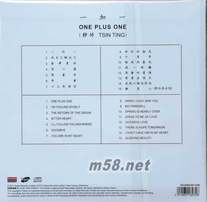 01. 一加一 02. 我自己騙自己 03. 春夢(mèng)重回 04. 苦心蓮 05. 跟著你 06. 再會(huì) 07. 心上有個(gè)你 08. 和你初相見 09. 十里亭 10. 臨別的春光 11. 說一個(gè)暢 12. 再會(huì)吧愛情 13. 希望在明天 14. 我的心里沒有他 15. 睡美人 (鄧白英合唱)