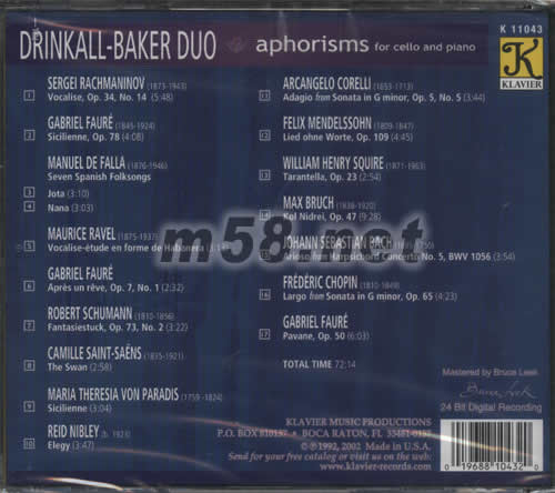 價格為估,以實到貨為準! 大提琴與鋼琴的格言DRINKALL BAKER DUO APHORISMS FOR CELLO AND PIANO(m58.net) 拉赫瑪尼諾夫,法雅,拉威爾,弗雷,舒曼,門德爾松等作品