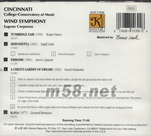 1.TUNBRIDGE FAIR(1950) WALTER PISTON 2.SINFONIETTA(1961) INGDF DABL 2.INTRODUCTION AND RONDO 3.PASTORAL NOCTUME 4.DANCE VERIATIONS 5.EMBLEMS(1964)AARON COPLAND 6.A CHILD'S GARDEN OF DREAMS(1983) DAVID MASLANKA 6.THERE IS A DESERT ON THE MOON WHERE THE DREAMER SINKS SO DEPLY INTO THE GROUND THAT SHE REACHES HELL 7.A DRUNKEN WOMAN FALLS INTO THE WATER AND COMES OUT RENEWED AND SOBER 8.A HORDE OF SMALL ANIMALS FRIGHTENS THE DREAMER,THE ANIMALS INCREASE TO TREMENDOUS SIZE AND ONE OF THEM DEVOURS THE LITTLE GIRL 9.A DROP OF WATER IS SEEN AS IT APPEARS WHEN LOOKED AT THROUGH A MICROSCOPE THE GIRL SEESTHAT THE DROP IS TULL OFTREE BRANCHES THIS PORTRAVS THE ORIGIN OF THE WORID 10.AN ASCENT INTO HEAVEN,WHERE PAGAN DANCES ARE BEING CELEBRATED;AND A DESCENT INTO HELL,WHERE ANGELS ARE DOING GOOD DEEDS 11.SLAVA(1977)LEONARD BERNSTEIN
