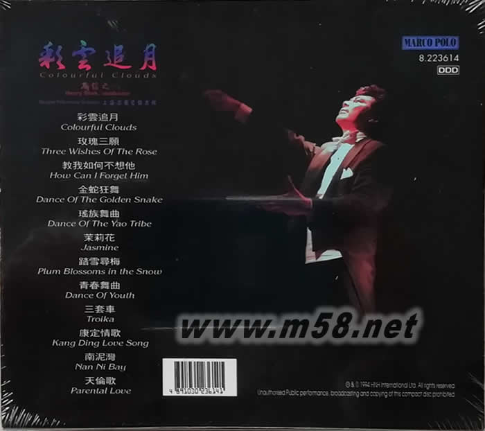 彩云追月 石信之 指揮上海樂團管弦樂隊(m58.net) 錄音市面上的中樂錄音已經多如牛毛,有何理由還要買這一張?聆聽此碟之前有此疑問,但聽了五秒鐘之后已經疑團盡失,主題曲《彩云追月》展現的空間感與音色系罕有的靚,再聽《玫瑰三愿》和《教我如何不想他》,弦樂之優美幾乎今我不相信此乃DDD純數碼錄音,到一曲《金蛇狂舞》播出時,那種鐘鼓齊鳴,金光燦爛的爆棚場面今人拍掌叫好,沒法不同意。這是近年錄的最出色的中樂制作。