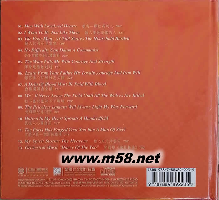 01. Men With Loyal,red Hearts 都有一顆紅亮的心 0'55'' 02. I Want To Be Just Like Them 做人要做這樣的人 4'31" 03. The Poor Man’s Child Shares The Household Burden 窮人的孩子早當(dāng)家 1'04" 04. No Difficulty Can Daunt A Communist 天下事難不倒共產(chǎn)黨員 2'02" 05. The Wine Fills Me With Courage And Strength 渾身是膽雄赳赳 1'51" 06. Learn From Your Father His Loyalty,courage And Iron Will 學(xué)你爹心紅膽壯志如鋼 3'23" 07. A Debt Of Blood Must Be Paid With Blood 血債還要血來償 1'51" 08. We’ll Never Leave The Field Until All The Wolves Are Killed 打不盡豺狼決不下戰(zhàn)場 2'39" 09. The Priceless Lantern Will Always Light My Way Forward 光輝照兒永向前 3'01" 10. Hatred In My Heart Sprouts A Hundredfold 仇恨入心要發(fā)芽 3'17" 11. The Party Has Forged Your Son Into A Man Of Steel 黨教兒做一個(gè)剛強(qiáng)鐵漢 2'18" 12. My Spirit Storms The Heavens 雄心壯志沖云天 7'55" 13. Orchestral Music "Dance Of The Yao" 管弦樂《瑤族舞曲》 7'40"