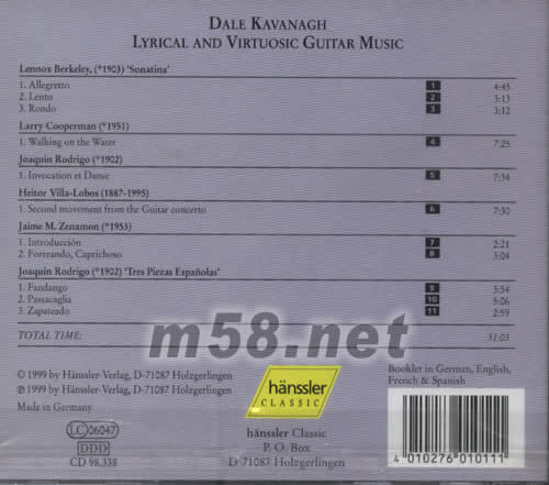 01.Allegretto 02.Lento 03.Rondo 04.Walking on the Water 05.Invocation et Danse 06.Second movement from the Guitar concerto 07.Introduccion 08.Forreando,Caprichoso 09.Fandango 10.Passacaglia 11.Zapateado