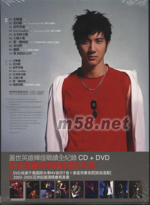 CD 01. 在梅邊 02. 花田錯 03. 蓋世英雄 (Featuring Jin 歐陽靖 & 李巖) 04. Kiss Goodbye 05. 完美的互動 (Featuring Rain & J-Lim) 06. 大城小愛 07. 第一個清晨 08. 哥兒們 09. 讓開 10. 愛 因為在心中 DVD - 蓋世英雄專輯精彩MV7首 + 麥當勞廣告歌 我就喜歡 - 花田錯 - Kiss Goodbye - 完美的互動 - 大城小愛 - 蓋世英雄 - 在梅邊 - 第一個清晨 - 我就喜歡