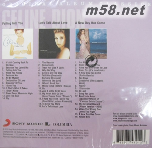 DISK 1 CD 1. Falling Into You It`s All Coming Back to Me Now 2. Because You Loved Me 3. Falling into You 4. Make You Happy 5. Seduces Me 6. All by Myself 7. Declaration of Love 8. Dreamin` of You 9. I Love You 10. If That`s What It Takes 11. I Don`t Know 12. River Deep, Mountain High 13. Call the Man 14. Fly DISK 2 CD 1. Let`s Talk About love The Reason 2. Immortality 3. Treat Her Like a Lady 4. Why Oh Why 5. Love Is on the Way 6. Tell Him 7. Where Is the Love 8. When I Need You 9. Miles to Go (Before I Sleep) 10. Us 11. Just a Little Bit of Love 12. My Heart Will Go On (Love Theme from 〞Titanic〞) 13. I Hate You Then I Love You 14. To Love You More 15. Let`s Talk About Love DISK 3 CD 1. A New Day Has Come I`m Alive 2. Right in Front of You 3. Have You Ever Been in Love 4. Rain, Tax (It`s Inevitable) 5. New Day Has Come 〔Radio Remix〕, A - (remix) 6. Ten Days 7. Goodbye`s (The Saddest Word) 8. Prayer 9. I Surrender 10. At Last 11. Sorry for Love 12. A£n Existe Amor 〔L`Amour Existe Encore〕 〔Spanish Version〕 13. The Greatest Reward 〔Album Version〕 14. When the Wrong One Loves You Right 15. A New Day Has Come 16. Nature Boy