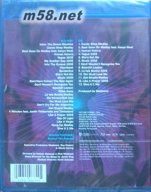 BLU-RAY 01. Intro: The Sweet Machine 02. Candy Shop Medley 03. Beat Goes On Medley feat.Kanye West 04. Human Nature 05. Vogue 2008 06. Die Another Day 2008 07. Into The Groove 2008 08. Heartbeat 09. Borderline 10. She`s Not Me 11. Music 2008 12. Rain/Here Comes The Rain Again 13. Devil Wouldn`t Recognize You 14. Spanish Lesson 15. Miles Away 16. La Isla Bonita Medley 17. Me Darava/Doli Doli 18. You Must Love Me 19. Don`t Cry For Me Argentina 20. Get Stupid Medley 21. 4 Minutes feat.Justin Timberlake And Timbaland 22. Like A Prayer 2008 23. Ray Of Light 24. Like A Virgin 25. Hung Up Medley 26. Give It 2 Me DVD BONUS FOOTAGE: Behind-The-Scenes CD 01. Candy Shop Medley 02. Beat Goes On Medley (feat.Kanye West) 03. Human Nature 04. Vogue 2008 05. She`s Not Me 06. Music 2008 07. Devil Wouldn`t Recognize You 08. Spanish Lesson 09. La Isla Bonita 2008 10. You Must Love Me 11. Get Stupid Medley 12. Like A Prayer 2008 13. Give It 2 Me