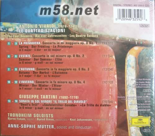 -3.LA PRIMAVERA,concerto in mi maggiore op.8 no.1 spring . Der friihling . Le printemps in e major.e-dur . En mi majeur 4-6.L'ESTATE,concerto in sol minore op.8 o.2 summer. Der sommer . L'ete in g minor . G-moll.en sol mineur 7-9.L'AUTUNNO,concerto in fa maggioro op.8 no.3 autumn.der herbst.l'automne in f major.f-dur.en fa majeur 10-12.L'INVERNO,concerto in fa minore op.8 no.4 winter . Der winter .l'hiver in f minor .f-moll.en fa mineur GIUSEPPE TARTINI (1692-1770) 13-16.SONATA IN SOL MINORE"IL TRILLO DEL DIAVOLO" "devil's trill"./teufelstriller-sonate/le trille du diable/in g minor.g-moll.en sol mineur TRONDHEIM SOLOISTS bjarne fiskum,leader.qyvind gimse,violoncello.knut johannesen,harpsichord ANNE-SOPHIE MUTTER,soloist and conductor