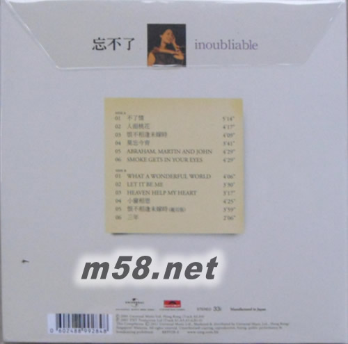 忘不了 2001 最后錄音 黑膠(m58.net) 180g 黑膠大碟 日本壓製 鄧麗君於法國生活時,偶爾於錄音室錄下來的最后絕唱 2001年由臺灣著名音樂製作人李壽全重新混音製作 三首全新編曲作品“人面桃花/恨不相逢未嫁時/莫忘今宵” 九首歌從未收錄的作品, 包括“不了情/三年/Smoke Gets In Your Eyes/ What A Wonderful World/Let It Be”