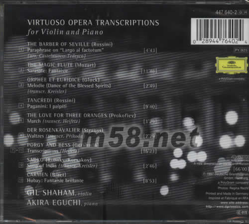The Barber Of Seville(Rossini) 1.Paraphrase on "Largo al factotum"[4'43] (arr:Castclnmovo-Tedesco) The Wagic Flute(Mozart) 2.Sara tate:Fantaisie[11'48] Orphee Et Euiridice(Gluck) 3.Melodie(Dance of the Blessed Spirits)[2'49] (transcr:Kreisler) Taricredi(Rossini) 4.Paganini:1 palpiti[9'40] The Love For Three Oranges(Prokofiev) 5.March(transcr:Heifetz) Der Rosenkavalier(Strauss) 6.Waltzcs(transcr:Prihoda)[7'29] Porgy ad Bess(Gershwin) 7-11.Transcra ttnns(Heifetz)[16'23] Sadko(Rimsky-Korsakov) 12.Song of India(transcr:Kreisler0[2'46] Carmen(Bizet) 13.Hubay:Fantaisie brillante[8'53] Gil Shaham,violin