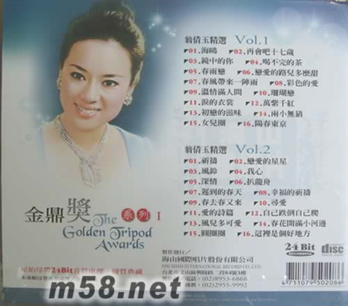 翁倩玉精選Vol.1 01. 海鷗 02. 再會吧十七歲 03. 鏡中的你 04. 喝不完的茶 05. 春雨戀 06. 戀愛的路兒多么甜 07. 春風(fēng)帶來一陣雨 08. 彩色的愛 09. 溫情滿人間 10. 珊瑚戀 11. 淚的衣裳 12. 萬紫千紅 13. 初戀的滋味 14. 兩小無猜 15. 女兒圈 16. 陽春東京 翁倩玉精選Vol.2 01. 祈禱 02. 戀愛的星星 03. 風(fēng)鈴 04. 我心 05. 深情 06. 扒龍舟 07. 遲到的春天 08. 幸福的祈禱 09. 春去春又來 10. 尋愛 11. 愛的詩篇 12. 自己跌倒自己爬 13. 風(fēng)兒多可愛 14. 春花開滿小河邊 15. 圓圈圈 16. 這里是個好地方