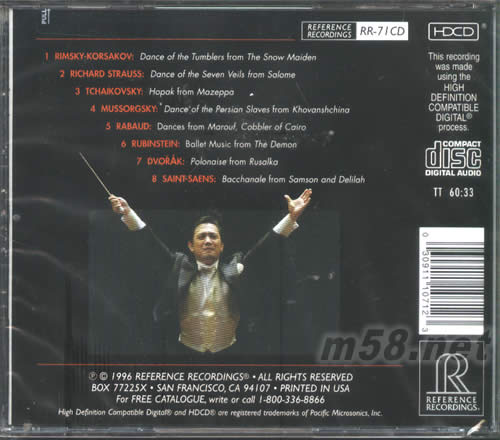 即使再不懂古典音樂的人,吸過這張CD中的音樂恐怕都會點頭稱善。這里的音樂迷人優美一百年后都可以令您大淌口水,24Bit 的 HDCD錄音更可令全世界發燒友喜極而泣,可怕的動態、精致的音場、纖毫畢現的分析力,要什么有什么,真是“燒”焦了!此碟提示音響迷:今后見到 R.R + 大植英次 + HDCD 的唱片張張要買。