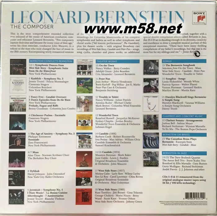 The Composer SYMPHONIES CONCERT THEATER WORKS BALLETS SONGS (25CD大套裝)(m58.net) 伯恩斯坦 Leonard Bernstein 音樂大師伯恩斯坦誕生100週年最佳獻禮。 伯恩斯坦堪稱是本世紀最偉大的指揮家、作曲家及鋼琴家。 伯恩斯坦的樂迷不可或缺的錄音,現代音樂愛好者必備的典藏。 2018年,將為1918年出生之音樂大師伯恩斯坦(Leonard Bernstein)100歲誕辰。為此,SONY唱片公司特別將旗下所擁有的伯恩斯坦創作樂曲之錄音,集合成這一套25CD專輯以示緬懷與紀念。 伯恩斯坦是集指揮家、作曲家、演奏家、教育家、理論家於一身的藝術大師,其藝術造詣舉世推崇,並堪稱是本世紀最偉大的指揮家、作曲家及鋼琴家。1918年8月25日出生於麻薩諸塞州的勞倫斯,而於1990年10月14日去世。其主要音樂教育完成於哈佛大學,1939年畢業后,又在寇蒂斯音樂院隨萊納學習作曲,1940年在壇格塢伯克夏音樂中心向庫塞維茨基(Sergey Koussevitzky)學習指揮。 本紀念特輯收錄25張CD之曲目,並以黑膠唱片封套的尺寸作為包裝設計。收錄他所創作的交響曲、協奏曲、室內樂、劇場作品、芭蕾與歌曲。其中部分作品還是由伯恩斯坦親自指揮與演奏。錄音母帶經24 bit/192 kHz重新處理,完美重現當年的錄音效果。 早在伯恩斯坦成為專業指揮前,就已經以作曲家身分聞名樂壇,擔任指揮后亦有不少杰作。重要作品有音樂歌舞劇「西城故事」(West Side Story, 1961)、「錦城春色」(On The Town, 1944),歌劇「憨第德」(Candide, 1956),第1號交響曲「耶利米亞」(Jeremiah, 1942)、第2號「不安的年代」(The Age of Anxiety, 1949)、第3號「卡迪希」(Kaddish, 1963),以及小提琴獨奏、弦樂與打擊樂的「小夜曲」(Serenade, 1954),芭蕾舞劇「自由想像」(Fancy Free, 1944)等。 伯恩斯坦的部分作品兼具有爵士樂的明朗個性與古典樂的深思性格。雖然是兩種相衝突的元素,伯恩斯坦的作曲卻能將他們融合妥貼,彰顯了他高明的作曲功力。若將他的作品改編以爵士樂演奏也就順理成章。因而專輯中也收錄了兩張由多位爵士樂手演奏的錄音,包含了Dave Brubeck Quartet, Gary Burton, The Aaron Bell, Eldar Djangirov, J. J. Johnson, Branford Marsalis, Gerry Mulligan, André Previn, Martial Solal, Richard Stoltzman等人的演奏。 儘管伯恩斯坦在指揮上的成績有目共睹,然而這套專輯更表彰了他在作曲上的成就,不僅是伯恩斯坦的樂迷不可或缺的錄音,更是現代音樂愛好者必備的典藏。