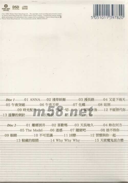 DISC 1 01 ANNA 02 淺草妖姬 03 漫長路 04 又是下雨天 05 午夜突破 06 午夜天使 07 化蝶 08 站別 09 時光配件 10 不顧一切 11 獨醉之后 12 不能替代你 13 溫馨的刺針 14 長得很 15 I LOVE YOU SO DISC2 01 離鄉別井 02 喜歡嗎 03 天長地久 04 你在何方 05 THE MODEL 06 迷惑 07 隨便吧 08 舍不得你 09 眼睛 10 不可思議 11 兇戀 12 習慣與你一起 13 躲藏的眼睛 14 WHY WHY WHY 15 天使魔鬼混合體