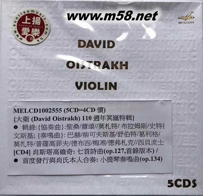 價格為估,以實到貨為準! Anniversary Edition 大衛110週年冥誕特輯 5CD套裝(m58.net) 輯錄:{協奏曲}:圣桑/蕭頌//莫札特/ 布拉姆斯/史特拉文斯基; {奏鳴曲}: 巴赫/柴可夫斯基/舒伯特/葛利格/ 莫札特/普羅高菲夫/德布西/梅湘/德弗札克//西貝流士[CD4] 肖斯塔高維奇: 七首詩曲(op.127,首錄版本) / 首度發行與肖氏本人合奏: 小提琴奏鳴曲(op.134)