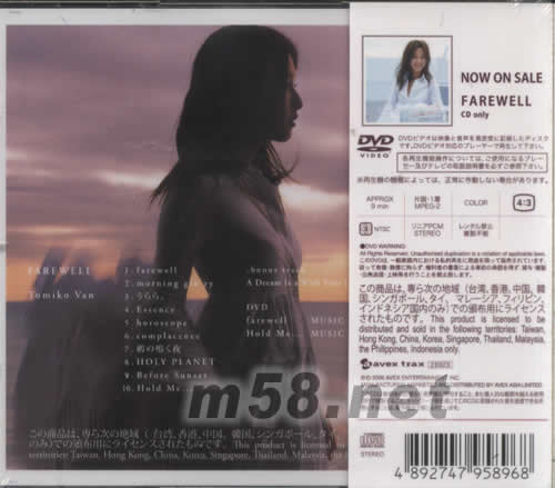 價格為估,以實到貨為準! 告別無限(m58.net) 在一片嘆息聲中為6年活動劃上句點的「Do As Infinity大無限樂團」前主唱伴都美子,心中帶著11種不安與希望獨自踏出腳步重新出發的個人首張專輯「FAREWELL 告別無限」。收錄專輯同名主打曲「farewell」、日劇「SLOW DANCE」插曲「Hold Me...」等共11首曲目。收錄bonus track迪士尼童話「仙履奇緣」主題曲「A Dream Is a Wish Your Heart Makes」。DVD收錄「farewell」、「Hold Me…」的音樂錄像帶。