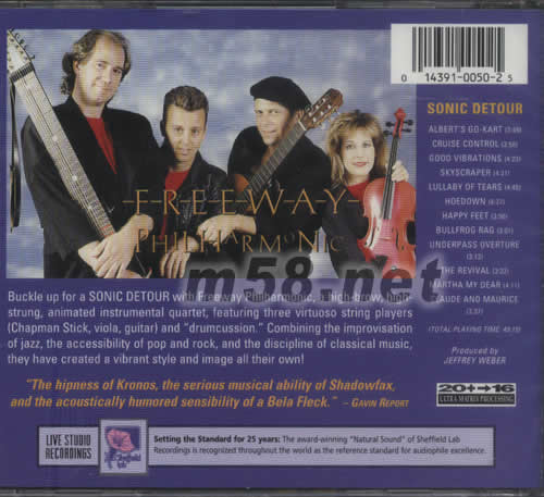 SONIC DETOUR高速公路四重奏(喇叭花系列)(m58.net) 高速公路四重奏 四人組合的新力音隊替發燒錄音公司(喇叭花)灌錄了這張風格嶄新的CD,揉合了民歌和流行曲最精彩吸引的元素,音色自然無比,令整體有極協調的演出.
