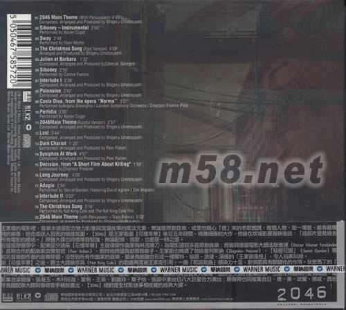 1.2046Main Theme(With Percussion) Composed,Arranged and Producd by Shingeru Umebayashi 2.Siboney_Instrumental/Perfomed by Xavier Cugat 3.Sway/Performed by Dean Martin 4.The Christmas Song (Fast Version) Arranged and Produced by Shigeru Umebayashi 5.Julien et Barbara Composed,Arranged and Produced by Delerue,Georges 6.Siboney/Performed by Connie Francis 7.Interlude I Composed,Arranged and Produced by Shigeru Umebayashi 8.Polonaise COmposed,Arranged and Produced by Shigeru Umebayashi 9.Casta Diva,from the opera"Norma" Performed by Angela Gheorghiu/London Symphony Orchestra/Direction Evelino Pido 10.Perfidia/Perfomed by Xavier Cugat 11.2046 Main Theme(Rumba Version) Composed,Arranged and Produced by Shigeru Umebayashi 13.Dark Chariot/Composed ,Arranged and Produced by Peer Raben 14.Sysiphos At Work Composed,Arranged and Produced by Peer Raben 15.Decision,from"A Short Film About Killing"Composed,Arranged and Produced by Zbigniew Preisner 16.Long Journey Composed,Arranged and Produced by Shing Umebayashi 17.Adagio Performed by Secret Garden,Featuring David Agnew(Cor Anglais) 18.Interlude II Composed,Arranged and Produced by Shigeru Umebayashi 19.The Christmas Song Performed by Nat King Cole and The Nat King Cole Trio 20.2046 Main Theme(With Percussion~Train Remix) Composed,arranged by Produced by Shigeru Umebayashi