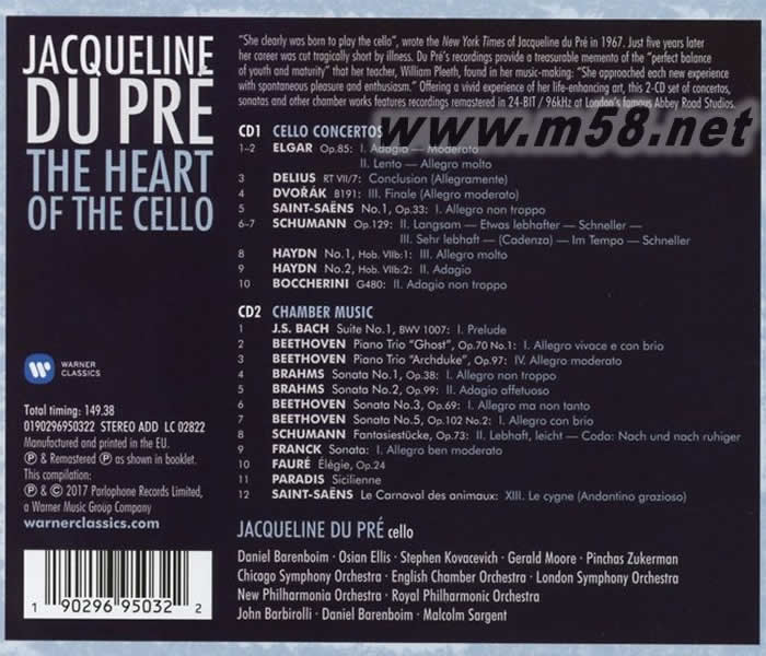 杜普蕾 逝世三十周年紀(jì)念精選 大提琴之心 The Heart of the Cello(m58.net) 大提琴家杜普蕾逝世三十週年紀(jì)念發(fā)行。 專輯精選大提琴家杜普蕾在以生命詠唱的協(xié)奏曲、奏鳴曲、室內(nèi)樂錄音,包括幾乎已經(jīng)與她畫上等號的艾爾加大提琴協(xié)奏曲。母帶均在英國著名的艾比路錄音室以24-bit/96kHz重新后製。