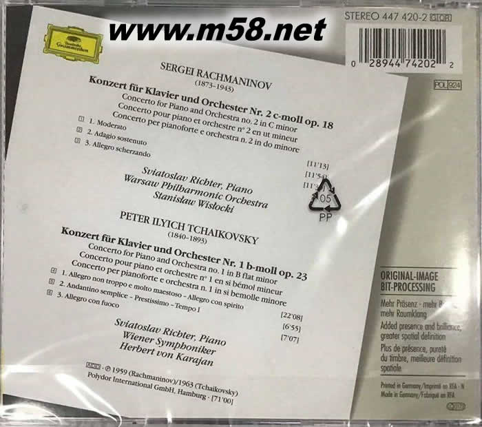 RACHMANINOV TCHAIKOVSKY PIANO CONCERTOS拉赫曼尼諾夫:第二鋼協(xié),柴可夫斯基:第一鋼協(xié) 大禾花版(m58.net) 卡拉揚指揮 Rachmaninov, Tchaikovsky: Piano Concertos ·柴可夫斯基第一拉赫馬尼諾夫第二鋼琴協(xié)奏曲 ·鋼琴演奏:Sviatoslav Richter李赫特 ·指揮:Wislocki, Herbert von karajan ·樂團:Warsaw National Philharmonic Orchestra, Vienna Symphony Orchestra ·錄音:Germany, 1996 俄國近代最具傳奇性的鋼琴家在六○年代以后才開始在西方國家露面,可是早在這之前,他在俄國的部份錄音就已經(jīng)被許多西方的愛樂者視為珍寶般的傳頌不已,其中最為人喜愛的就是他的俄國作曲家協(xié)奏曲錄音,這也就是本片兩首俄國經(jīng)典協(xié)奏曲成為后來暢銷名盤的重要原因。尤其是李希特與卡拉揚的合作,在未發(fā)行前更是當時許多樂評家談?wù)擃A(yù)測的話題。這是一份屬於傳奇與神話的演奏,而DG在這里給了我們雙份的傳奇,把當年的兩張名盤結(jié)合成一張重新發(fā)行