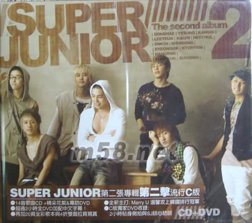 價格為估,以實到貨為準! 第二擊C版(臺版)(m58.net) super junior 第二張專輯第二擊流行C 版 .14首歌曲CD+精采花絮&專訪DVD .超過2小時全DVD加配中文字幕 .再加20頁全彩歌本與4折雙面拉頁寫真 .全新主打:Marry.U 溫馨攻上韓國排行冠軍 .C版獨家DVD收錄: 2小時貼身側拍與SJ談心訪談