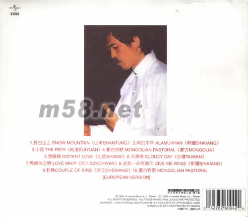 01. 長白山上 SNOW MOUNTAIN [山東SHANTUNG] 02. 阿拉木罕 ALAMUKHAN [新疆SINKIANG] 03. 小路 THE PATH [綏遠(yuǎn)SUIYUAN] 04. 蒙古牧歌 MONGOLIAN PASTORAL [蒙古MONGOLIA] 05. 想親親 DISTANT LOVE [山西SHANSI] 06. 天黑黑 CLOUDY DAY [臺(tái)灣TAIWAN] 07. 馬車夫之戀 LOVE WHIP [四川SZECHWAN] 08. 送我一朵玫瑰花 GIVE ME ROSE [新疆SINKIANG] 09. 對(duì)鳥 COUPLE OF BIRD [浙江CHEKIANG] 10. 蒙古牧歌 MONGOLIAN PASTORAL [EUROPEAN VERSION]